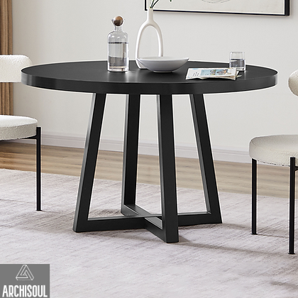Table ronde en bois noir avec un piètement géométrique élégantChaises avec structure en acier confortables et designUn contraste parfait entre le noir profond et la douceur du blanc