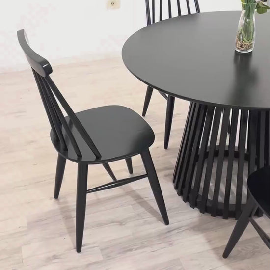 Apportez une touche d’audace et d’élégance à votre intérieur avec cette table ronde au design résolument contemporain. Son plateau circulaire en finition noire brillante s’harmonise parfaitement avec sa base sculpturale, composée de lattes verticales formant un socle cylindrique ouvert et aérien.Son design graphique, à la fois minimaliste et sophistiqué, en fait une pièce maîtresse idéale pour une salle à manger moderne, un espace bureau design ou même un coin café haut de gamme. Robuste et stable, elle allie parfaitement esthétique et fonctionnalité.Un choix parfait pour les amateurs de mobilier d’exception